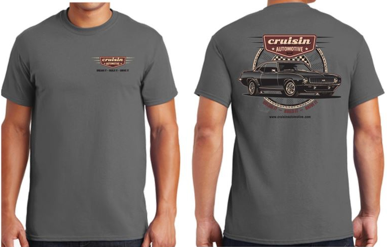 Look great in our Cruisin Automotive inspired range of apparel. Shirt shows Cruisin Automotive logo on front with a Camaro on the back.