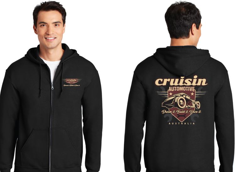 Look great in our Cruisin Automotive inspired range of apparel. Hoodie shows Cruisin Automotive logo on front with a Hot Rod on the back.